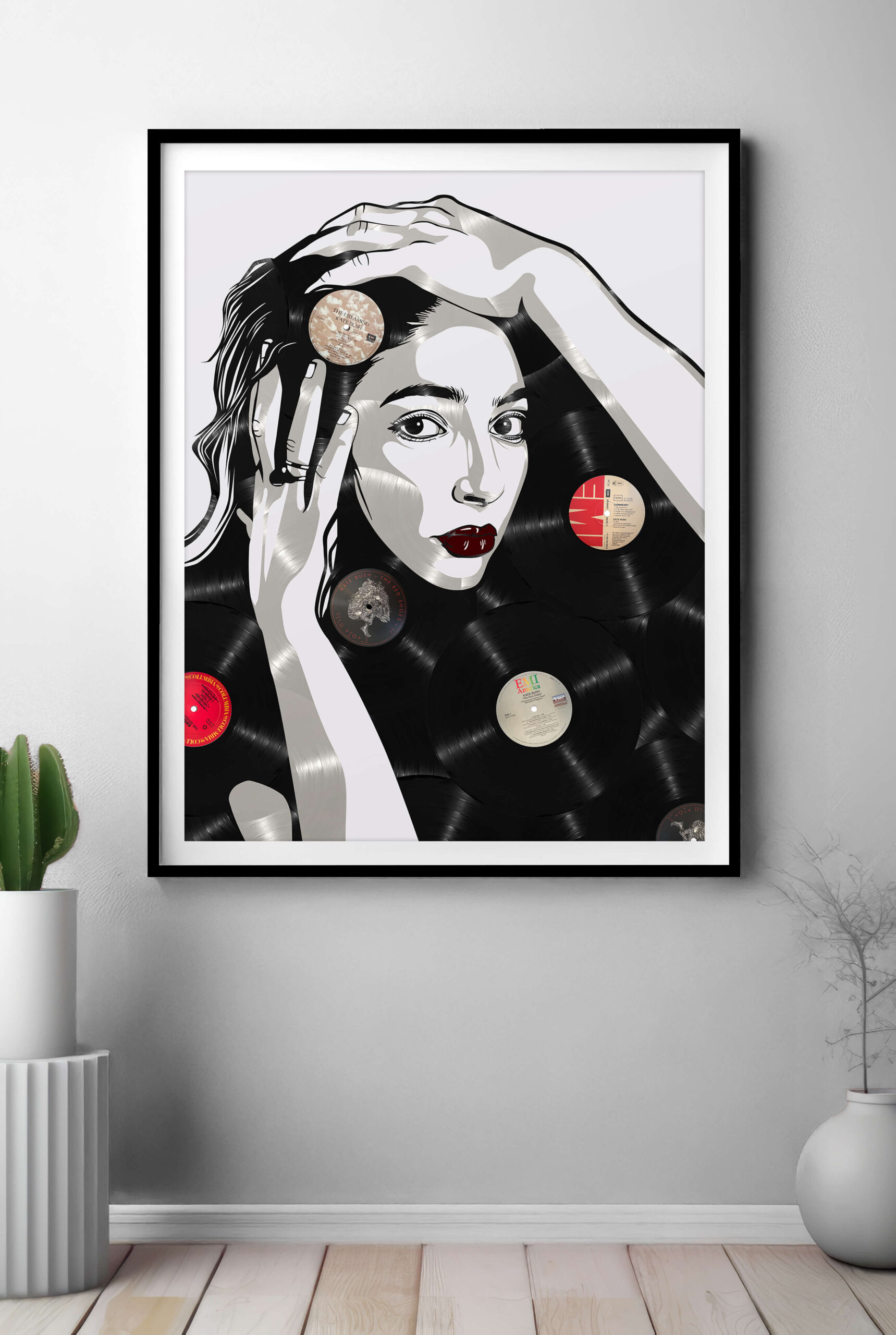 “The Kick Inside” is a striking tribute to the legendary Kate Bush, crafted from 12 vinyl records and meticulously cut into 80 pieces. Featuring albums The Kick Inside, The Dreaming, The Sensual World, Lionheart, and The Red Shoes, this artwork weaves together black, grey, and red vinyl to capture the ethereal essence of Bush’s music. A mesmerizing blend of sound and sculpture, it embodies the spirit of her visionary artistry.
